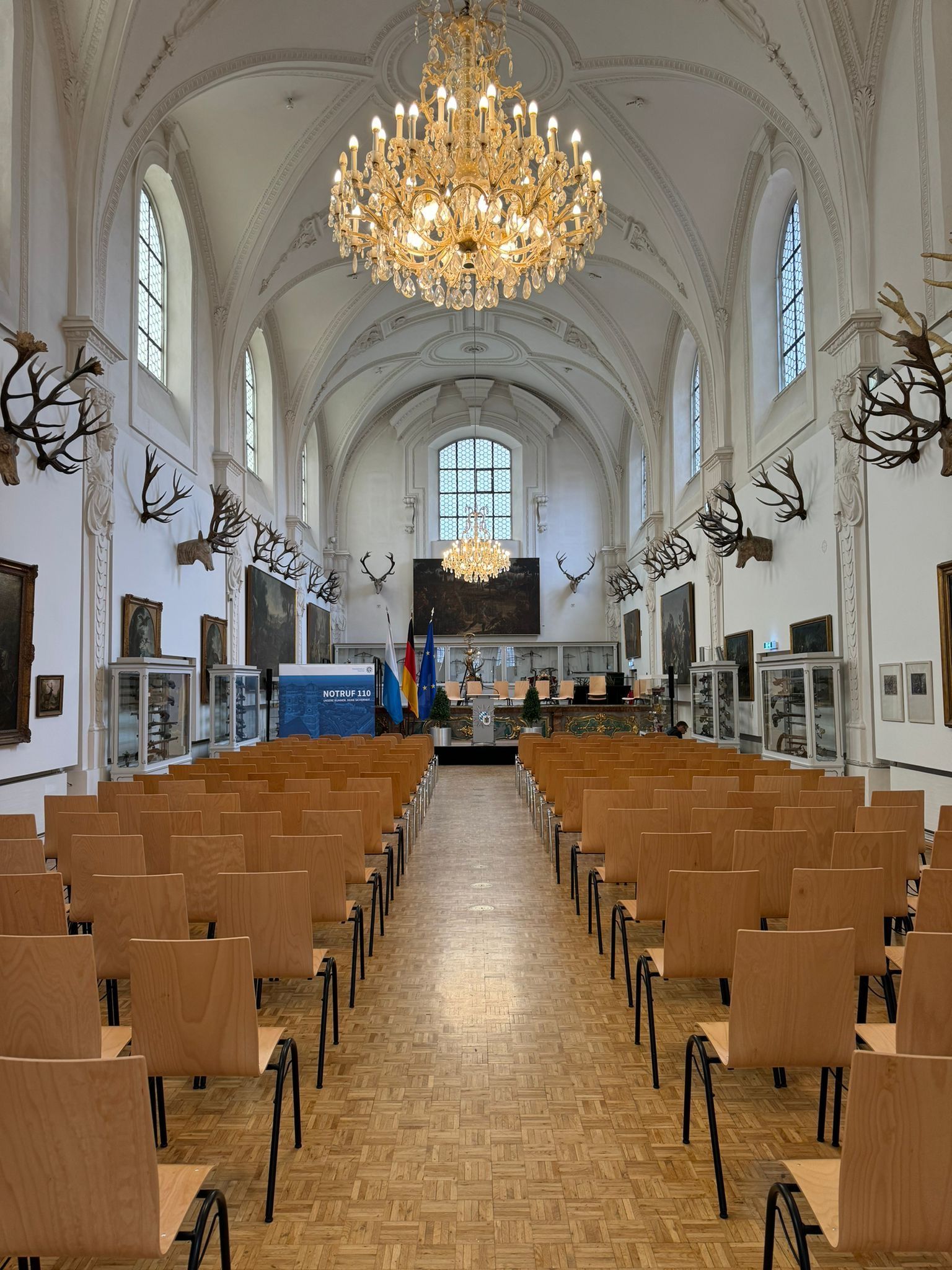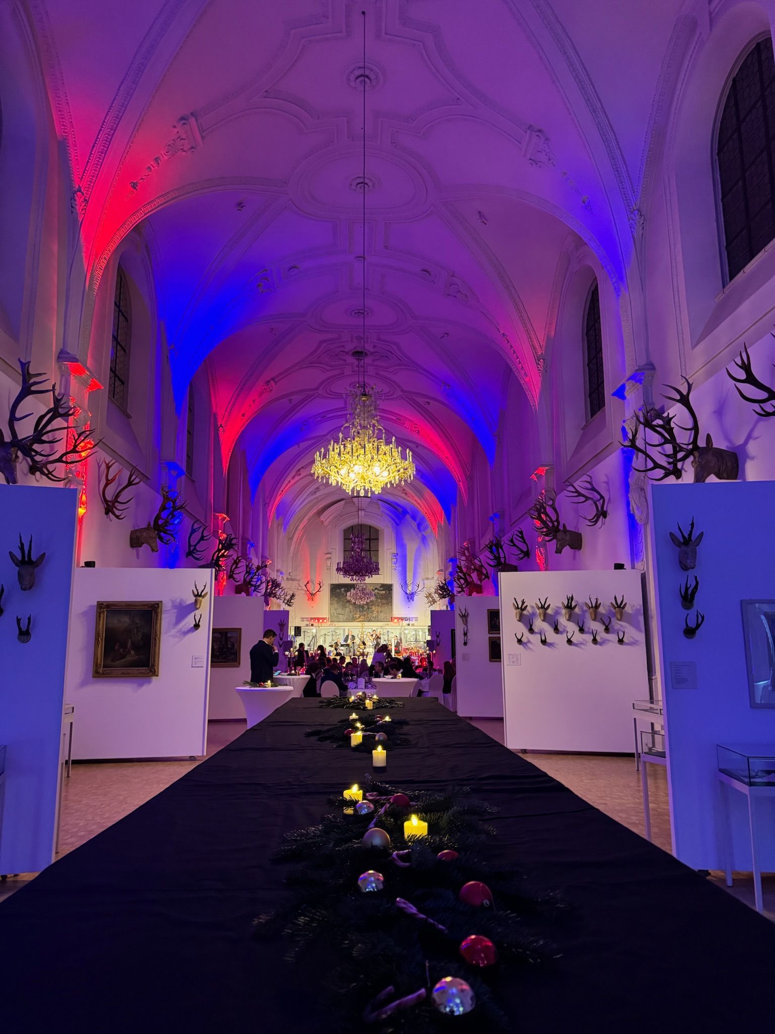 Von der Apsis geht es durch ein Kerzenspalier über Holzfstufen weiter in den Weißen Saal.